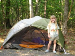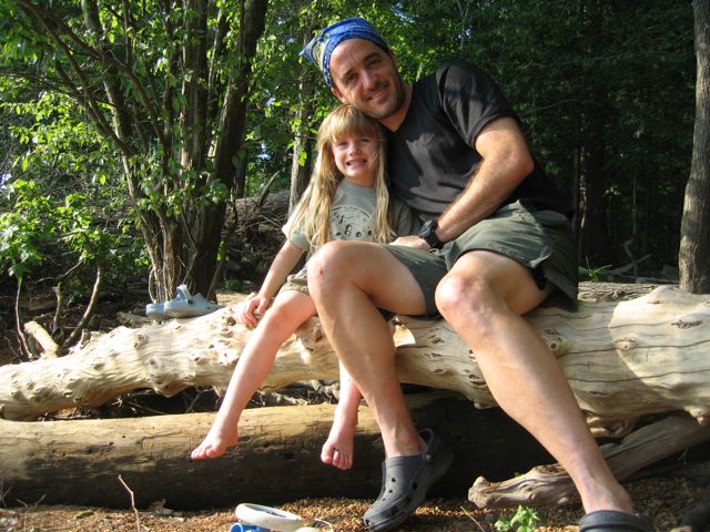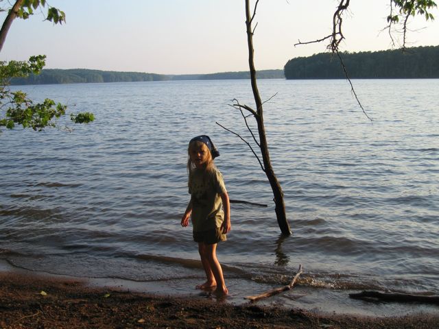 We retired to the tent around 8:45 or 9 p.m., when it was getting pretty dark and Riley was getting pretty tired. I read a few pages from “Walden” to her, which is really not age appropriate for her yet, but she still had some questions and I tried to point out some interesting points, or explain what Walden was writing about. We then slept as best we could in the tent. The 1st night is never as comfortable as the 2nd — or maybe on the 2nd you are just more tired! — but we made due, and overall Riley did very well. We awoke around 7:15 a.m., had breakfast — coffee for me, hot chocolate for Riley, oatmeal, pop tarts — packed up, and went back to the beach for a little while.