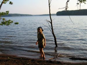 We also discovered that the last site in area B (site 15), had some trails down to the lake after all, so we were in luck! When we arrived, we set up the tent and grabbed some fire wood for later, and then we walked down the trails, which kind of disappear after bit into just woods, down to the water. This picture of Riley in front of the tent is blurry, but I wanted to include it since it is the only one we have of it.