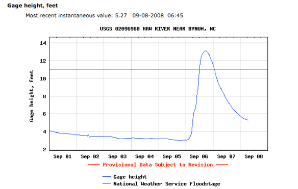 I drove by the 64 put-in on the Haw Saturday to see how the water looked, and it was crazy high. The chart below shows flood level at 11 feet at the Bynum Gage. I saw the water when it was around 13′. No way would I paddle that! But again, I have very little white water experience — I’ve been on a few guided whiter water rafting trips with class 3 rapids, and some class 2 in a canoe during an adventure race. While we picked up a used white water boat a couple years ago, we just haven’t had the time (and child care!) to go out.
