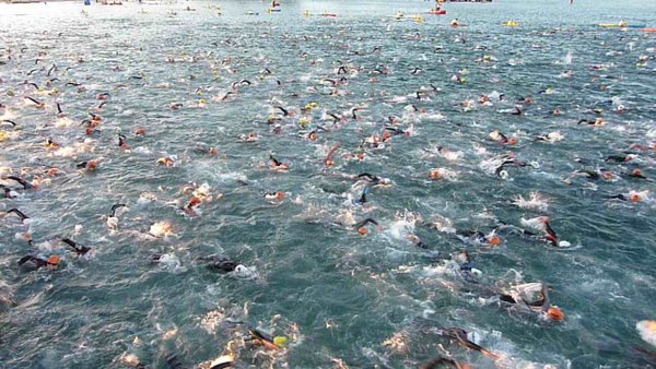 7:37 Still going strong, very methodical. Nearing the final turn on the swim and then maybe 300 meters in.