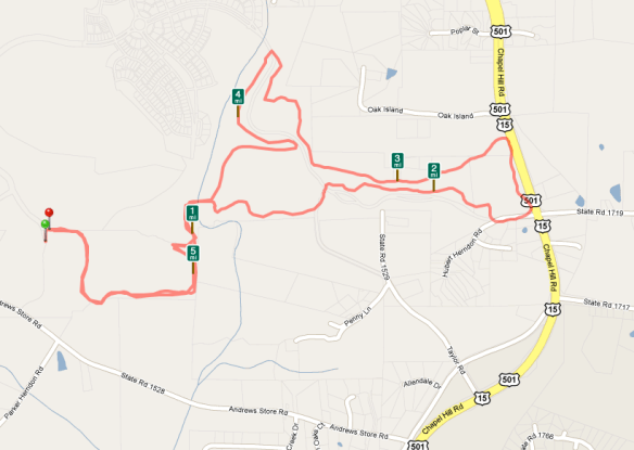 Description: Briar Chapel is a new “mega” development in Chatham County. They plan on miles of hiking and mountain biking trails, so that is great for those of us close enough by to use them! I’ve only been out here a few times. Right now there are a combination of double track/fire road and single track. The mountain bike trails can be quite technical and difficult for non experienced riders! They are tight and twisty, with lots of rocks and roots. The trail itself, when you are on it, is un-blazed but not difficult to follow. The difficulty comes from mixing and matching the fire roads and single track into one cohesive hike/run. You can park in the neighborhood itself where there is a marquee, though the trail map leaves a lot to be desired. The GPS track below shows parking at the construction area of the new school off Andrews Store road, just past Woods Charter. The single track on the back side of Woods Charter is quite nice, while the single track in the neighborhood on the south side of the “parkway” is quite technical. There is also the trail along the power lines, which in the summer I understand is over grown — so watch out for ticks and chiggers.