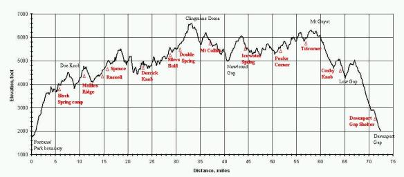 Here is an elevation profile and map… About 3 miles past Clingman’s dome, I would hit the Mt. Collins shelter trail head, and just past find the trail head for Fork Ridge down to the camp site.  I had spoken to a runner who had done the full SCAR just a few days prior and he said there was a sign on the AT for Fork Ridge, but my map did not show that, so I was not sure that would be the case.  But I was hopeful, and if not, Clingman’s Dome road was right next to the AT just past the Mt. Collins shelter split, so I knew I could find it from there.