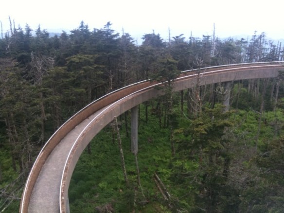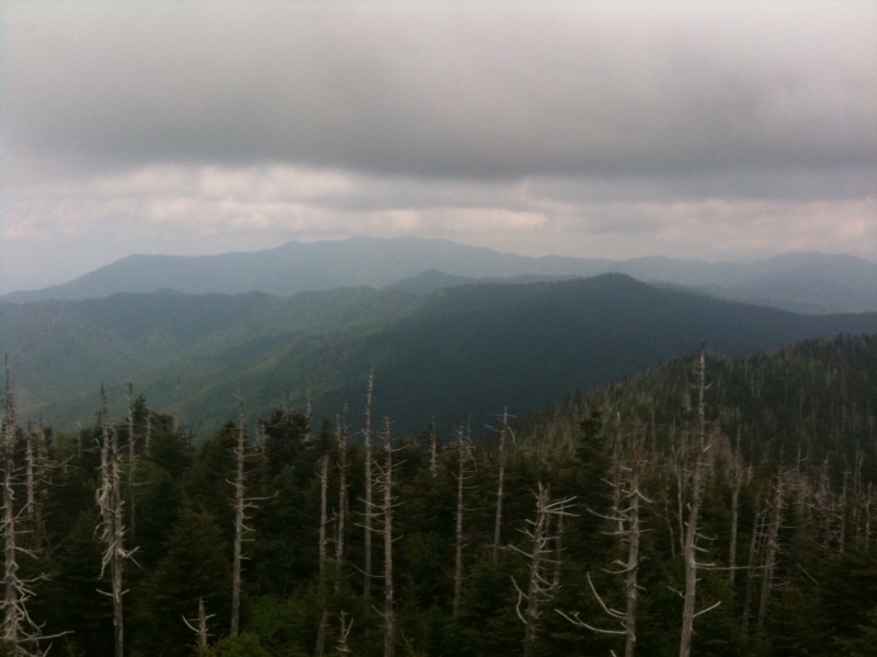 Once I passed Double Spring Gap shelter around mile 31, the trail opened up and there were mountains all around!  It was sad to see so many dying hemlocks, but it was nice to finally see something.  When I finally reached Clingman’s Dome, I had to run up the ramp to the watch tower, even though it was a little off trail.  With the road closed, it was deserted up there — much different than last time when it was crawling with tourists!  I had carried my phone on the off-chance there was service here, but had yet to take it out of my bag.  I pulled it out and there was AT&T E!  I sent a couple quick text messages to Kelly updating here on where I was and decided to snap a couple quick pictures.  For some reason, April and Mike’s phone number was missing, so I could not send them anything.  I doubt they would have received any messages from me as they would have been hiking down into the valley by now.
