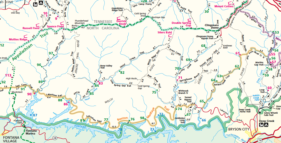 And a part trail map…  Start at the bottom left at Fontana Dam, run the AT, the green dotted trail all the way to Mt. Collins at the top right, then head down Fork Ridge, the purple trail, to site 53: