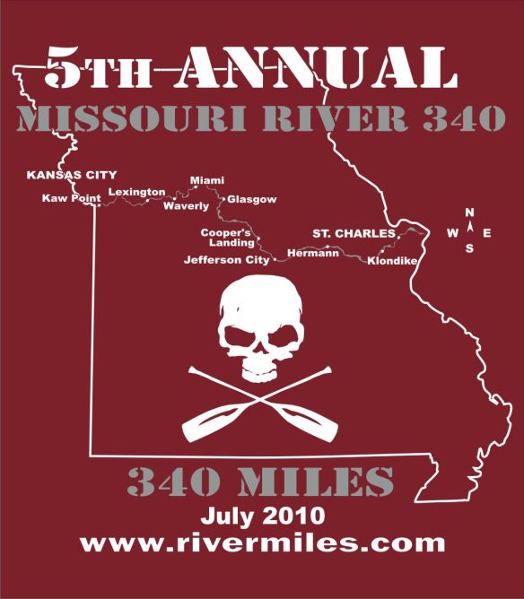 Here is the logo from this year’s shirt, which shows the map of the course. We’d be paddling from Kaw Point in Kansas City, all the way to St. Charles. The other points on the map would be the check points where we’d have to check in with race staff, and where we could stop and refuel. We were also allowed to “fly by” these as long as our ground crew made visual contact with us to check in for us.