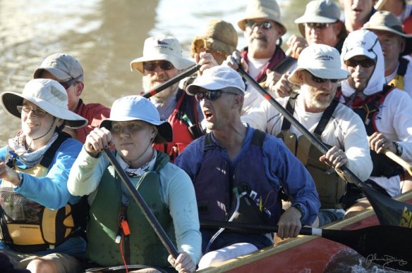 While all the paddlers got to change sides every 30 – 40 minutes, only a few of us got to change positions (rows). The 1st half of the race I was in row 9, and the 3 steer-ers would rotate through that row. It was good that we had row 10 with only one paddler — we had one person drop from the team the week before the race — but it would have been extremely tight if row 10 had two paddlers in it when we needed to switch steer-ers. The 2nd half of the race, I moved up to row two, which allowed me to meet some of the other paddlers. Even tough we were all in the same boat, at 41 feet we were spread out front to back pretty far, and there really is a sub-culture built around those you can easily talk with (the row immediately in front of you and behind you) and those you can somewhat talk with (two rows up and two rows back). Beyond that, not a lot of chatting occurs.