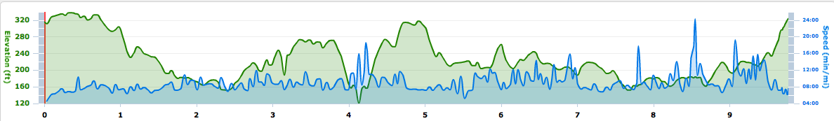 Here’s an elevation vs. speed graph, which really shows the two brutal hills — the 1st from mile 4 – 5 and the 2nd the last 1/2 mile of the race.  In reality, the last tenth or two tenths was flat to the finish, so I’m not sure why the Garmin doesn’t show it that way.   The course actually went down the same hill nea