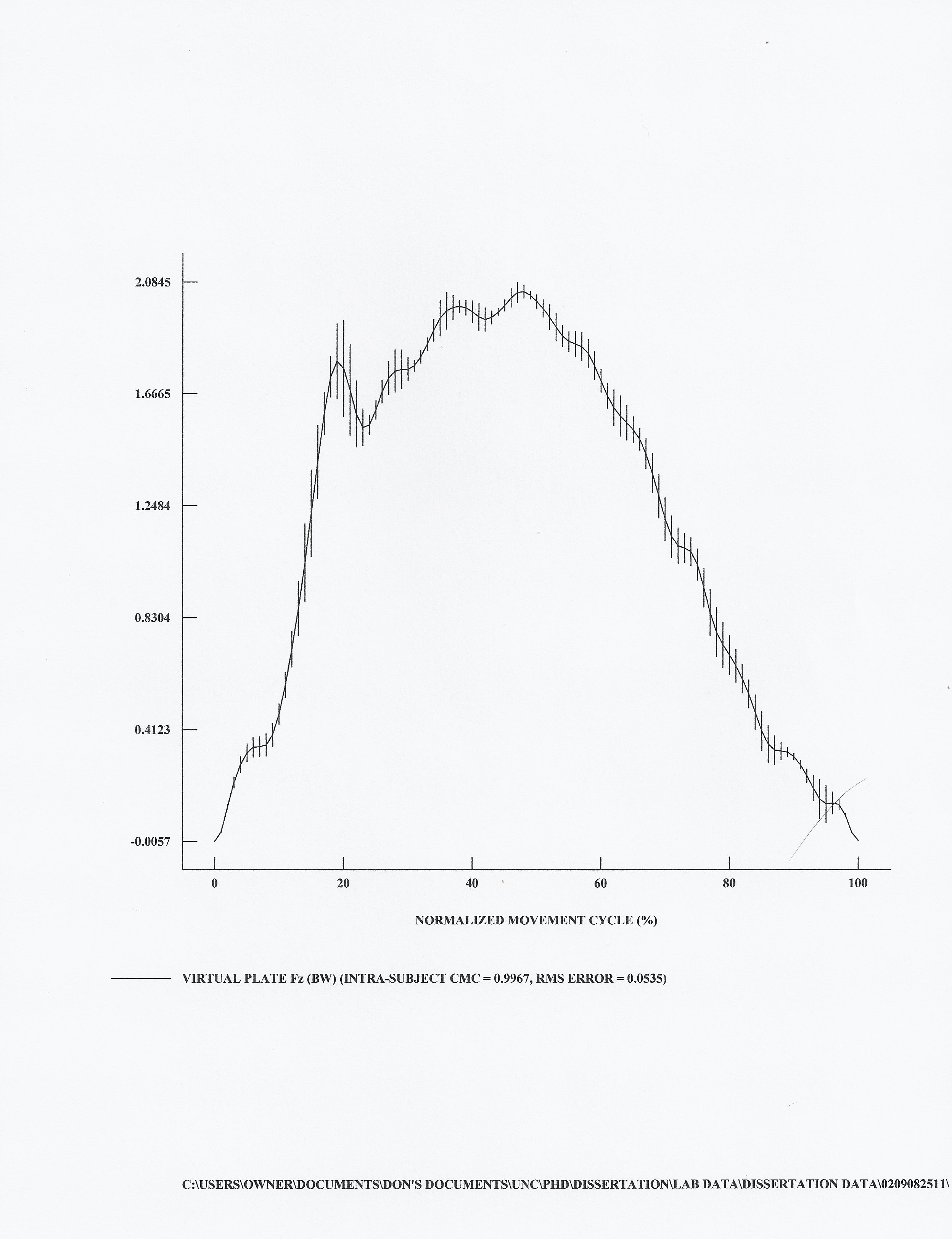 First is a composite of my ground reaction force across all the samples of data. What is interesting to me and the researcher is that most barefoot/minimalist runners do not have an impact transient — but I do, albeit slight. (For a quick summary of my barefoot history, see this post.) Overall my peak ground reaction force is on the very low end at 2X body weight, whereas the normal range for most runners it 2-3X. (This is one area where it would be nice to look at a faster run as I’m sure the GRF would go up at speed…) The researcher did say I have the lowest “bounce” in any runner he’s seen yet…