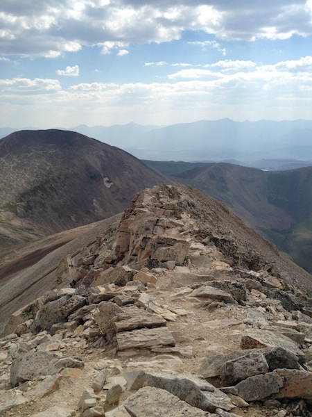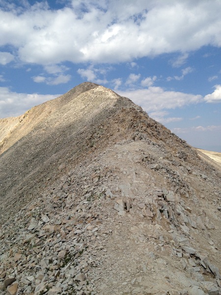 The last little ridge line is a bit sketchy… This was at 13,800′, and I really started thinking that 13,800 was good enough… This was about 4′ of solid ground in the middle, but both sides of that were scree — and 500′ drops (or more?) to your death. The picture really doesn’t do it justice to how precarious it looked! I’m not normally affected by heights, but this one was giving me a slight sense of vertigo..