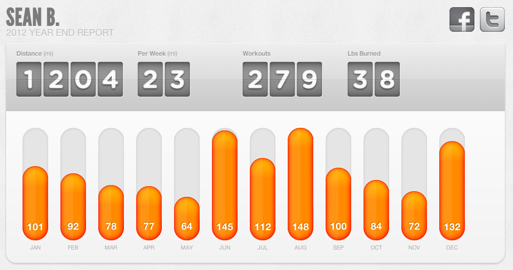 According to Daily Mile, where I log my work outs, I ran 1024 miles and averaged 23 miles per week. This might also include miles from other “sports” like mountain biking, hiking, paddling, but since I did almost ZERO of that in 2012 (other than hiking), it should be close enough.