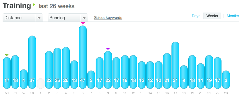 That said, I do want to show this year’s weekly mileage compared to last years. This year: