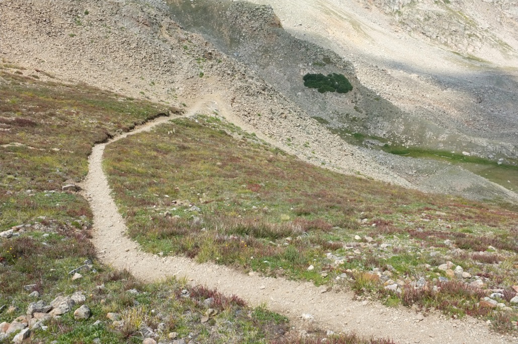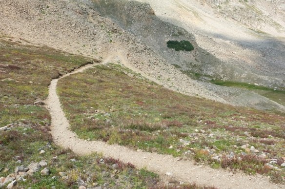 This was a 10-mile hike for me, round trip with 3,300′ elevation gain. The photos of me were done with a self-timer! The standing shot is along the trail, a few hundred feet below Hope Pass. And then the crouched shot is at the top. Between the significant climb and the altitude (above treeline), this peak earns some respect! I have a couple shots of the rugged trail so you can see how steep it gets! I averaged 2 miles per hour going up (granted, some photos and a few breathers were taken along the way) and then 3+ miles on the way down (I ran what I could). It is a lovely hike – Aspen, meadows with wildflowers, a stream with waterfalls, fragrant evergreens, and cool, but thin mountain air (it’s actually very chilly at the top – my hands were very cold!).