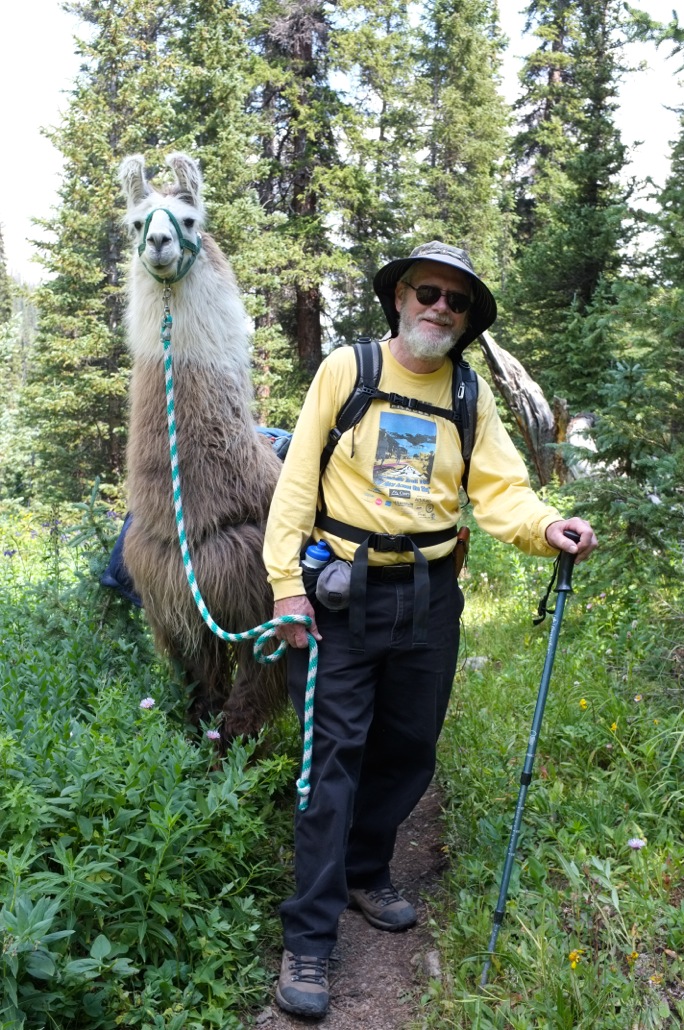 The trail (a “pass” between 2 mountains, both Hope and Quail are in the 13,000′ peak range) sits at 12,600′ above sea level with a view of the 3 lakes (our rental house is near the Twin Lakes). The lake/pond that is in closest view behind me is where they will have a race aid station (crew members not permitted). Sean will pass by the trail marker and ribbons at the top of Hope Pass (pictured, too – facing toward Winfield). Also pictured, I had the pleasure of bumping into 3 of the llama teams coming up the trail yesterday. They were hauling supplies, including 700 gallons of water for the racers. The herd of 34 llamas will stay there for a couple of days, eating off the land and drinking from the pond. Then they’ll haul everything back down the mountain after the race!