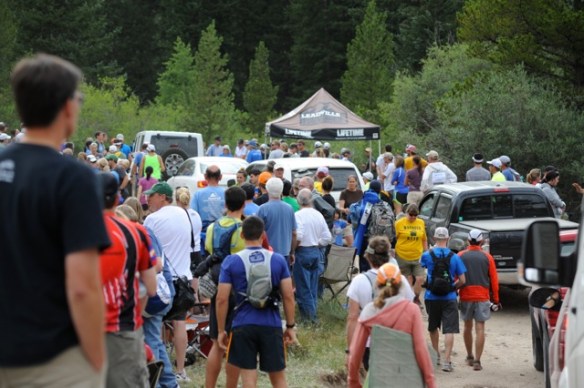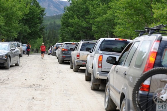The line of traffic into Winfield (FYI – that’s the race director walking down the middle!) and then a photo of some of the madhouse in the parking area… where the runners are crossing in and out of the checkpoint plus picking up volunteer pacers.