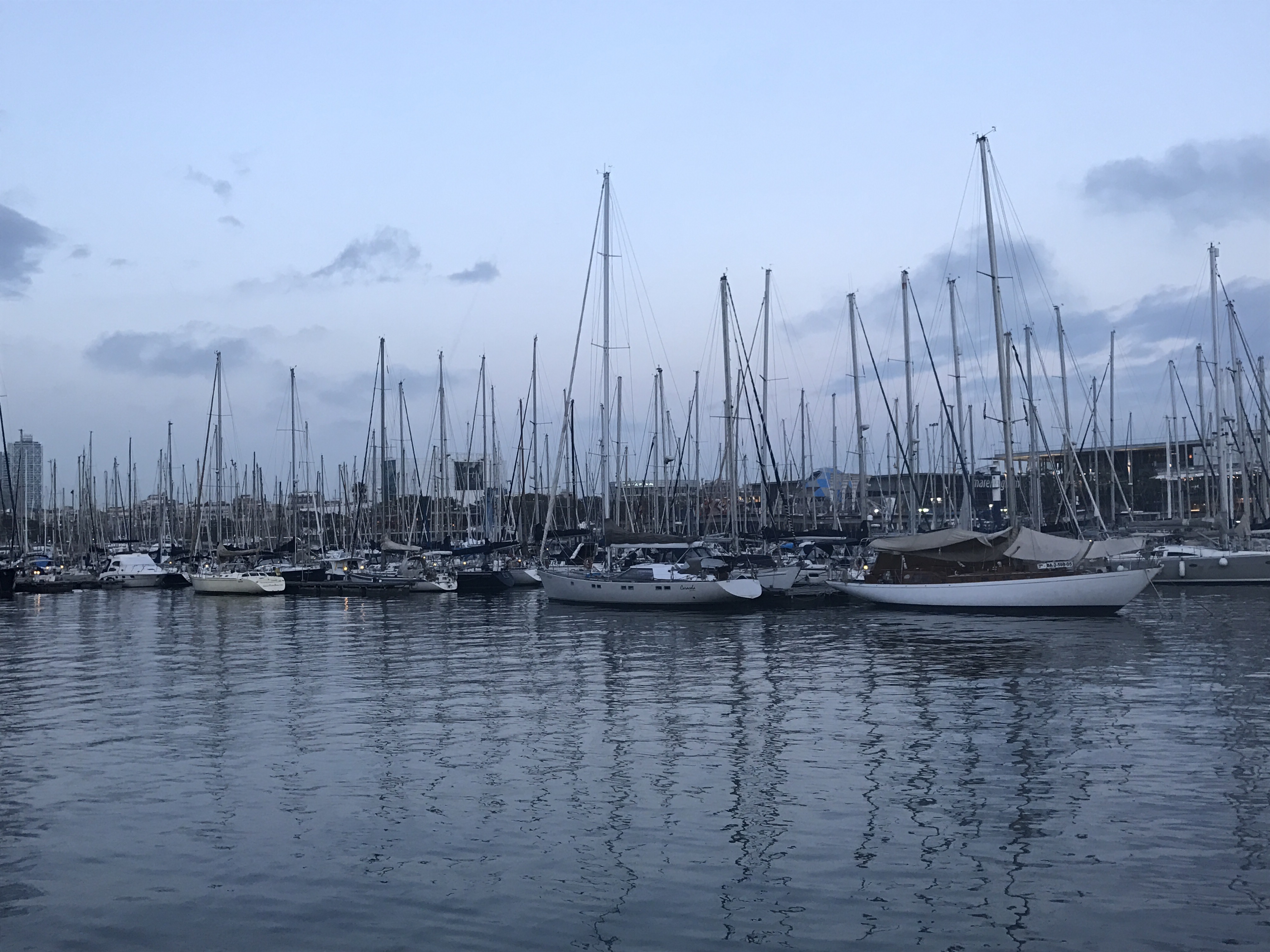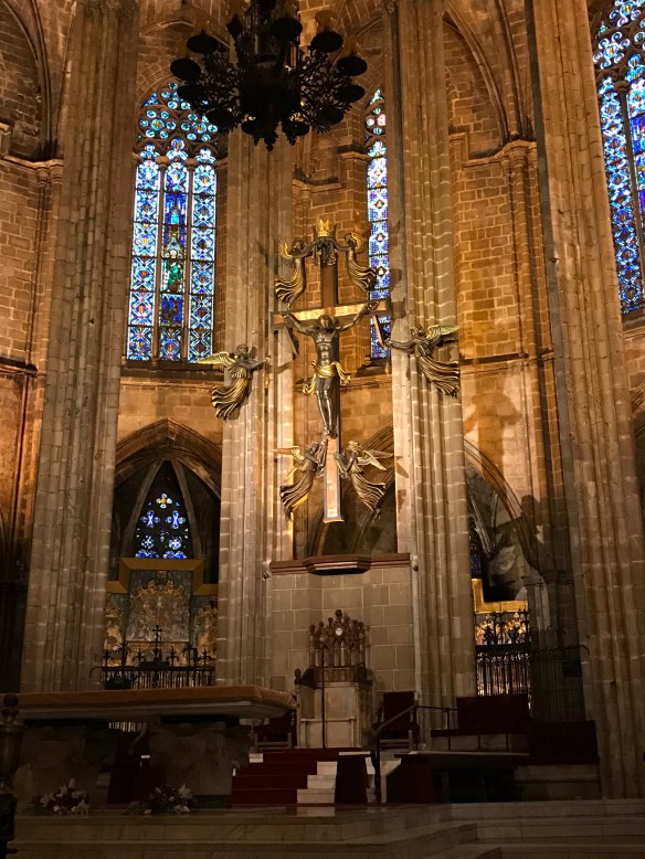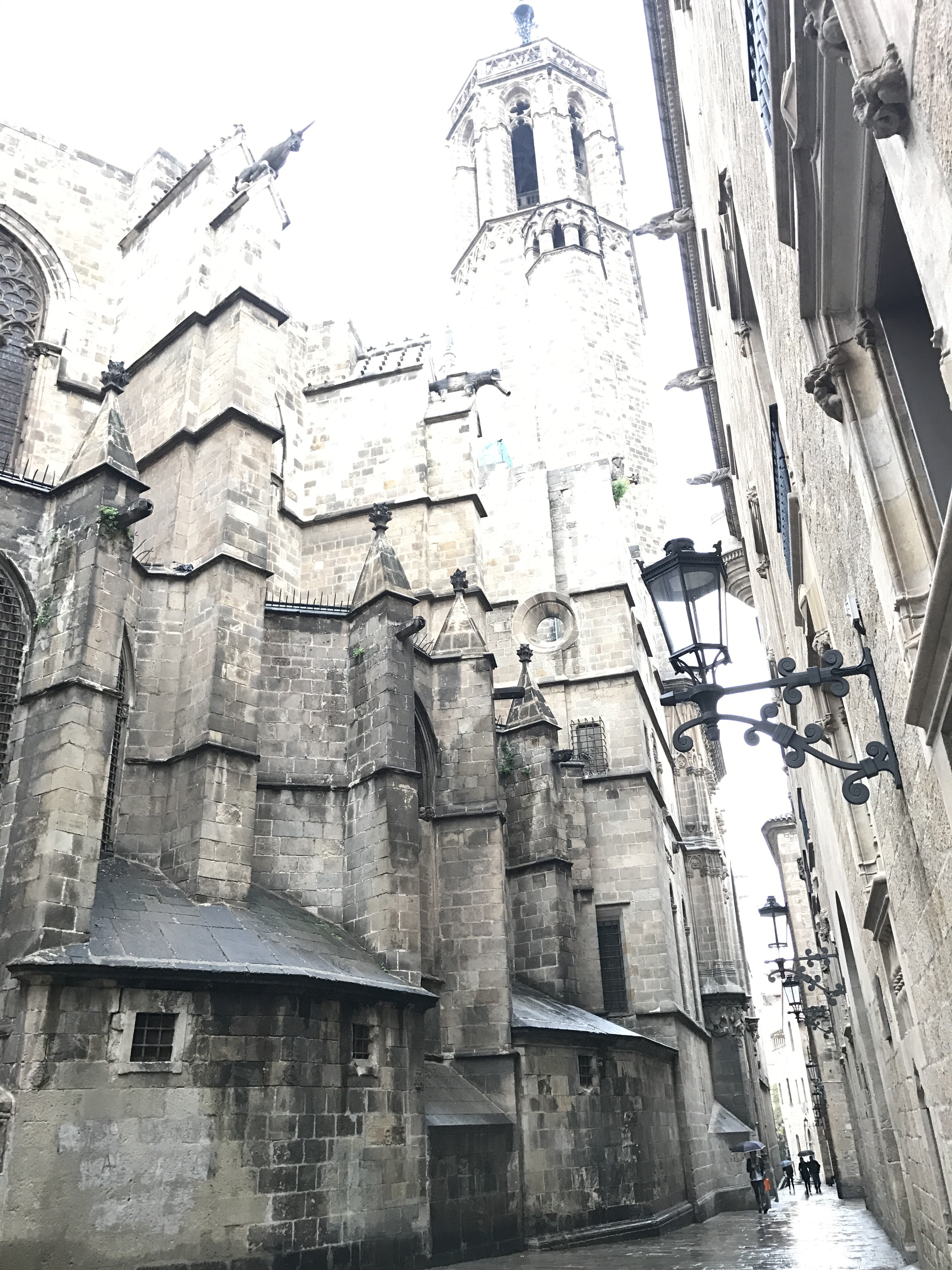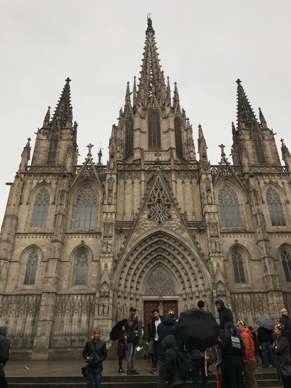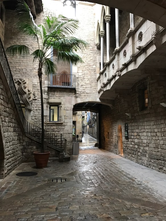 We arrived on the red-eye (neither of us slept much if at all) and then at the hotel around 8:30 a.m. after an easy taxi ride. Unfortunately our room wasn’t ready, so instead of a nap, we headed out to breakfast and then over to the Picasso museum. After that we also walked in and around The Cathedral of Barcelona. We went back to the hotel around 12:30 but still no room, so we went back out. But now it was raining pretty hard, so we just grabbed a coffee/tea in a small shop to wait a bit longer. We finally got a call around 1:30 that the room was ready so we headed back over and got a couple of hours of sleep. Now we should be able to handle a 9 or 10 p.m. dinner like the locals! 🙂