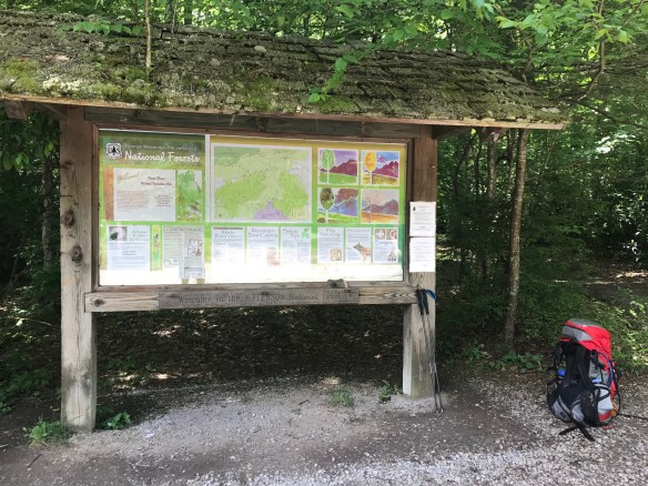 Trailhead sign (and my HEAVY pack — I packed enough to solo thru-hike the AT other than food!):