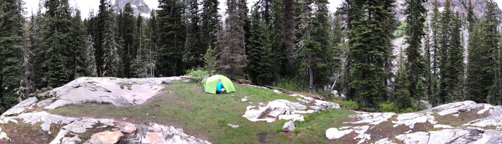 After that, it was another mile or so until we found the perfect camp site.  We were on a bit of a rock knoll — really a 3 sided cliff – with a small flat grassy spot on top.  We set up the tent and grabbed a quick lunch, just before we got hit by a huge hail storm!