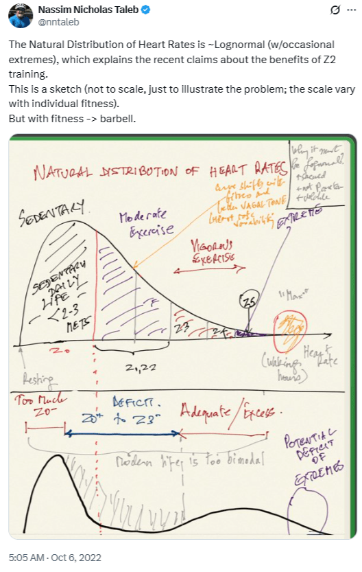 And reading a lot of Alan Couzens, who recommends 1000 or more calories burned per day during exercise. At low intensities (he’s big on zone 1 and low zone 2), that’s a couple hours per day. I’m not sure I can find more time to train, nor if I want to, but perhaps I can be more active in every day life, outside of training, while still maintaining ~500 hours per year (*). And more active throughout the day is what Taleb is getting at — most of us who train for big events tend to be pretty inactive outside of training, whereas historically, active humans were active for much longer periods each day.