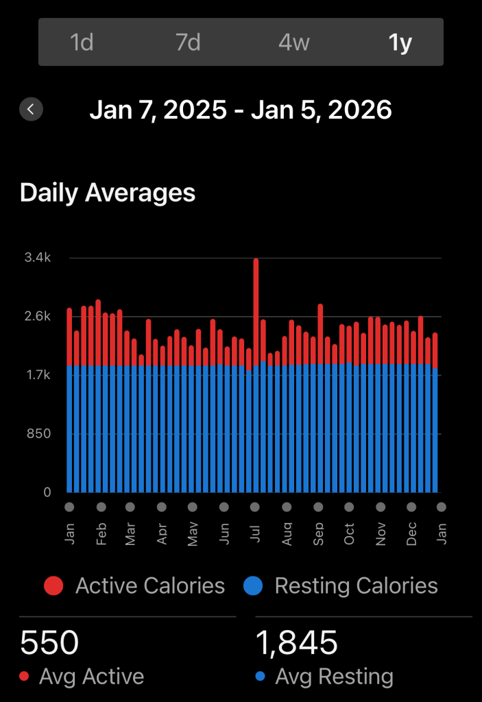 Garmin shows the following active and resting calorie burns for last year — yes I didn’t grab this on Jan 1 so it’s a bit of off for the calendar year, but it’s close enough: