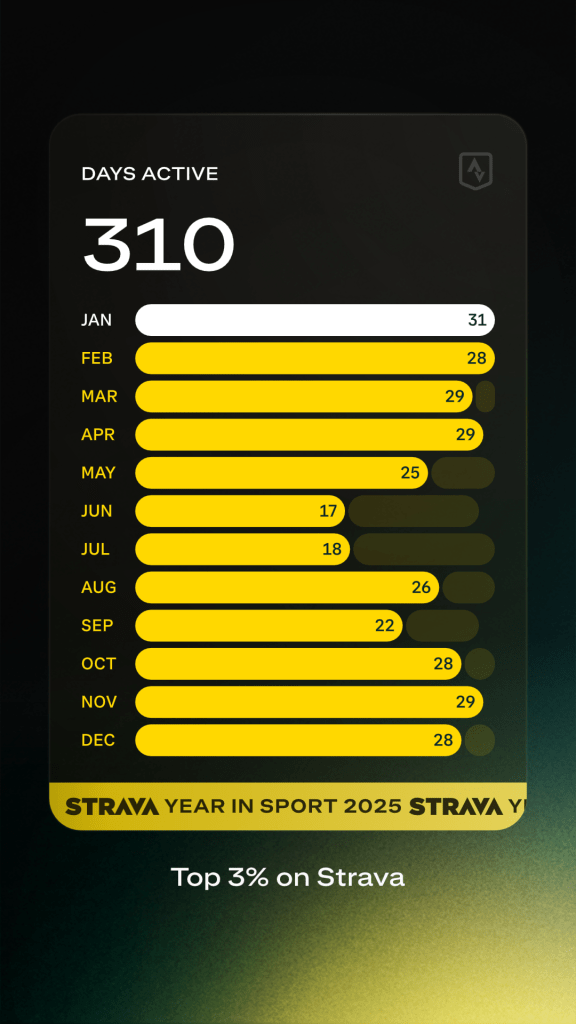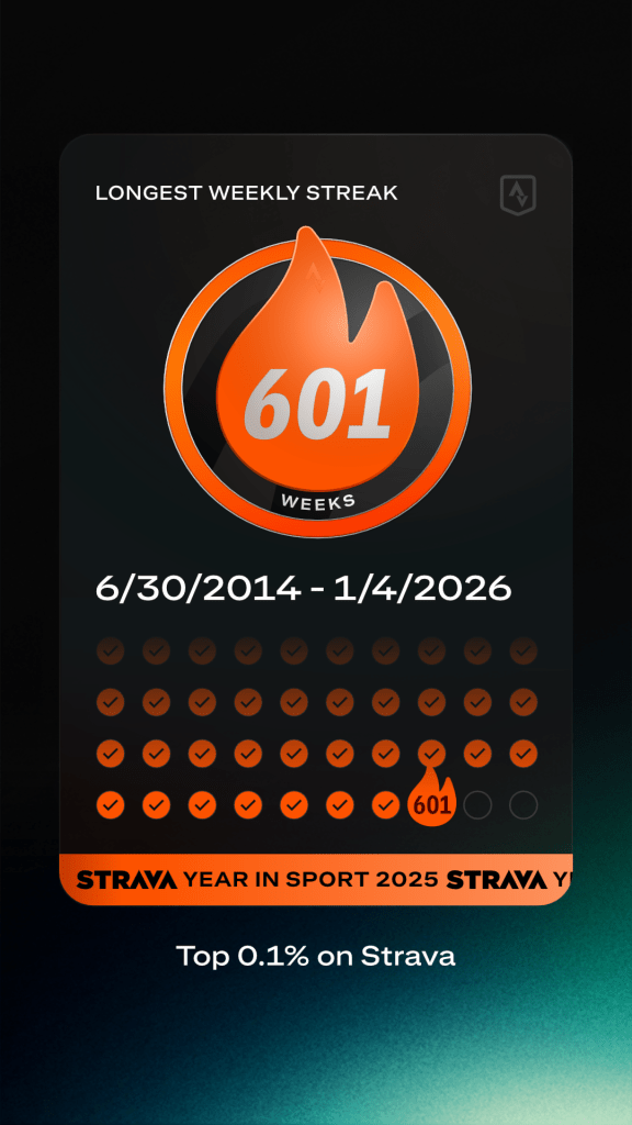 I can say that 2025 was far too little strength training, and I really need to get back to that. I can say the same about mobility work – it has really fallen off and I need to up my game there. I’m feeling it more now that I’m 55. I think I’ll combine mobility and strength numbers on Strava — there’s not a good separate breakout that works well with Garmin, and I tend to do them together anyway.
