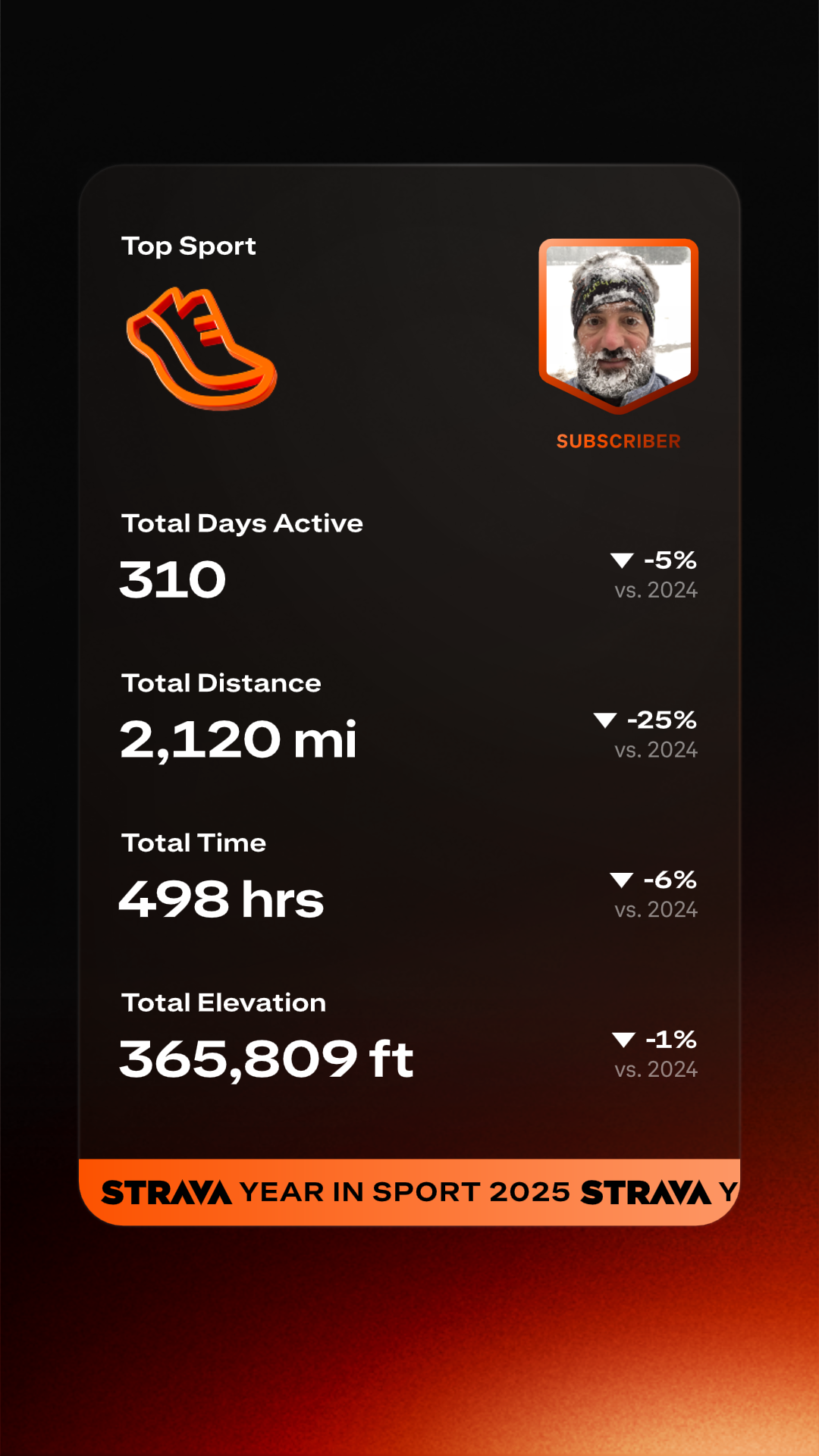 I can say that 2025 was far too little strength training, and I really need to get back to that. I can say the same about mobility work – it has really fallen off and I need to up my game there. I’m feeling it more now that I’m 55. I think I’ll combine mobility and strength numbers on Strava — there’s not a good separate breakout that works well with Garmin, and I tend to do them together anyway.