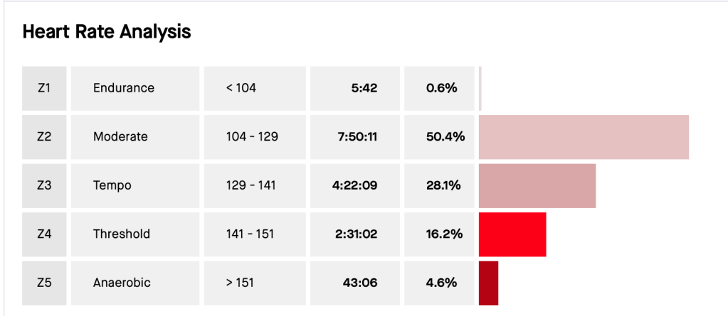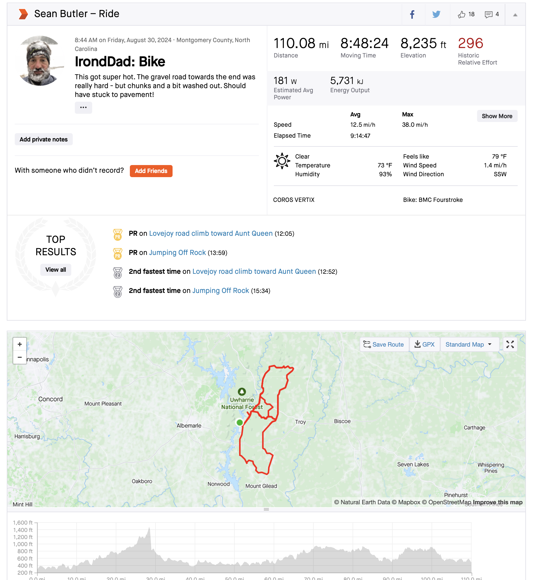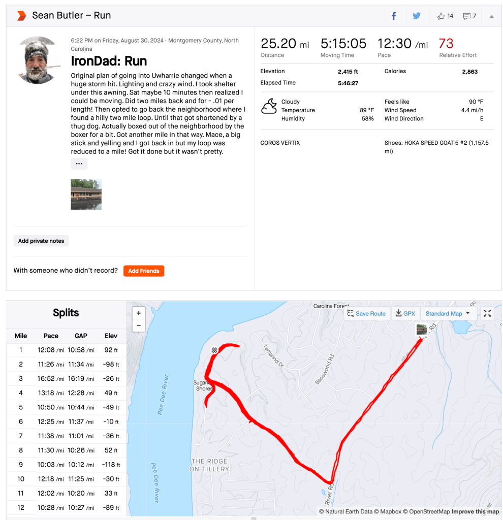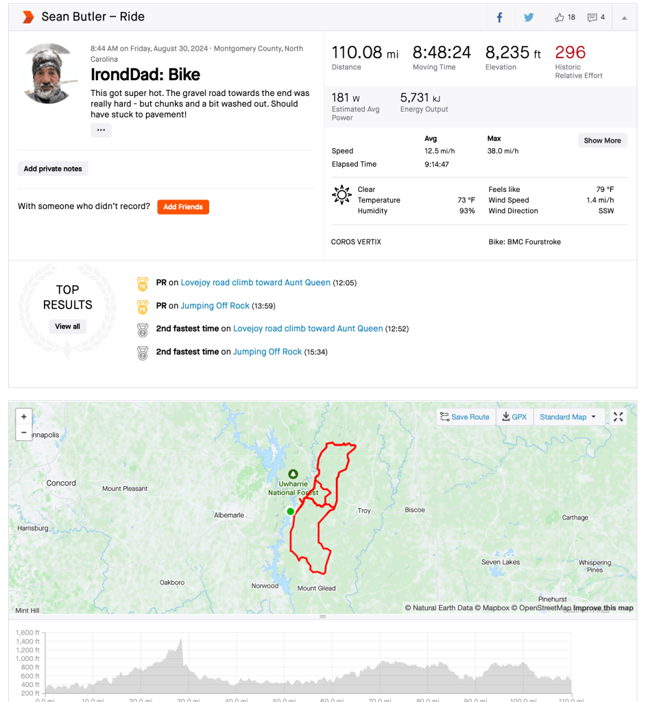 A few screen shots from Strava data. For the HR, that was my Whoop (on my wrist) broadcasting to my Coros, not a chest strap. But looking at it, I would think fairly accurate. (In reality I felt like I was red lining a lot, but know that wouldn’t have been possible…)