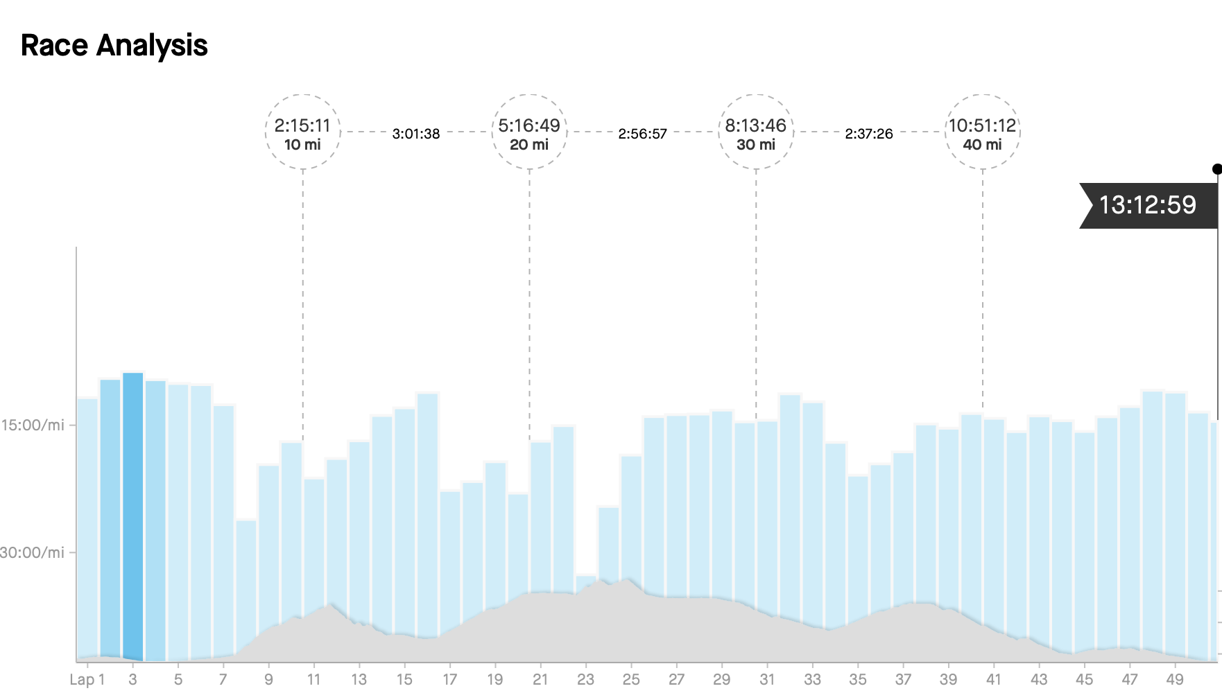 The race went better this year than 2 years ago. I felt so much stronger and would have expected my times to be even better than they were, but I’m not complaining. The only real issue I had this time is temperature regulation. Starting at midnight, and running in the mountains up and down from elevations of 1500-2000′ difference means you will get some temperature swings, but it felt like it could have been a little more than that. There were points where I felt clammy running downhill if I ran moderate for more than 8-10 minutes. Daylight came, I met Kelly at AS 5 (mile 31 or so), changed clothes, and the clamminess never really came back.