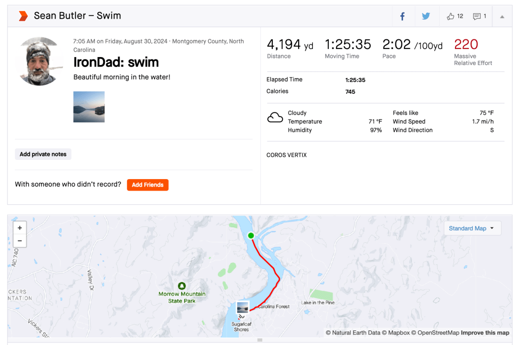But this was my chance to do it one time — in my own way. I first searched around for off road Iron Distance events, and only found one, but the location and timing of that didn’t work out. So I started thinking about doing my own solo / unsupported / non-event Ironman, and I came up with a plan… We’ve spent the last couple Labor Days at Lake Tillery, and I was able to work it out with the support of my brother-in-law and father-in-law to go a day early, to have them support me in the boat.