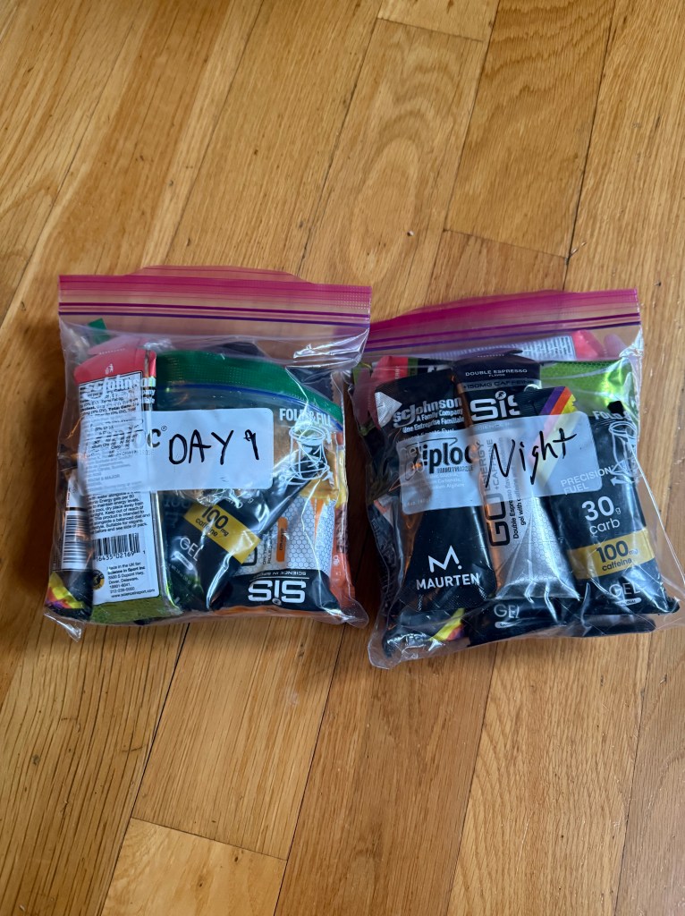 Below are the day and night bags I had made. Not shown in the day bag is that I put 4-500 calories of Tailwind in both of my bottles. These equate to about 2500-3000 calories each and about 4-500 mg of caffeine in the night bag. With the late start time and me thinking a single loop could be well over 13 hours, I ended up carrying a day bag distributed in my pack and belt as then threw in a night bag in the back of the pack – just in case. This saved me, as when we finally reached the fire tower about 18 hours in, I had to calorie count what I had left to ensure I could make it, otherwise I would have had to head back to camp from there.