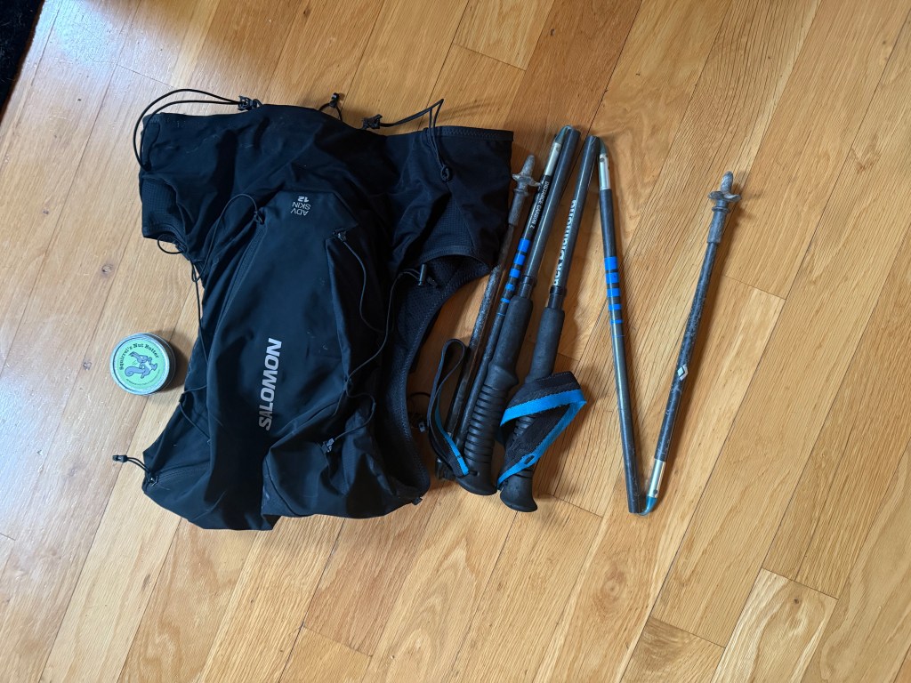 Not shown are a few items like a naked running belt etc. The pack was a Salomon Adv Skin 12 which was borderline too small — if the weather had looked bad I might have had to carry a larger pack. I did need my belt to hold a few things — some nutrition and the course description.