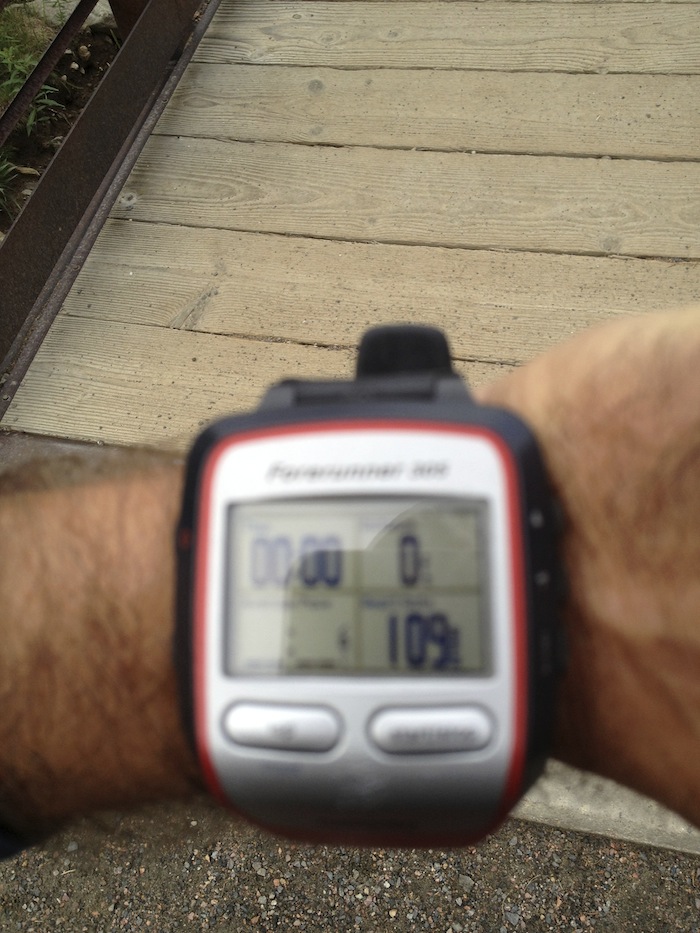 Hmm, HR already 109 and I’ve not even started running (hiking) -what’s up with that?? When we got out of the car in the parking lot, it was already 85-90, which I thought was odd. In hindsight, I think it was Gordo’s driving — passing other cars on the approach road (a single lane, nearly 4WD only road!). 🙂