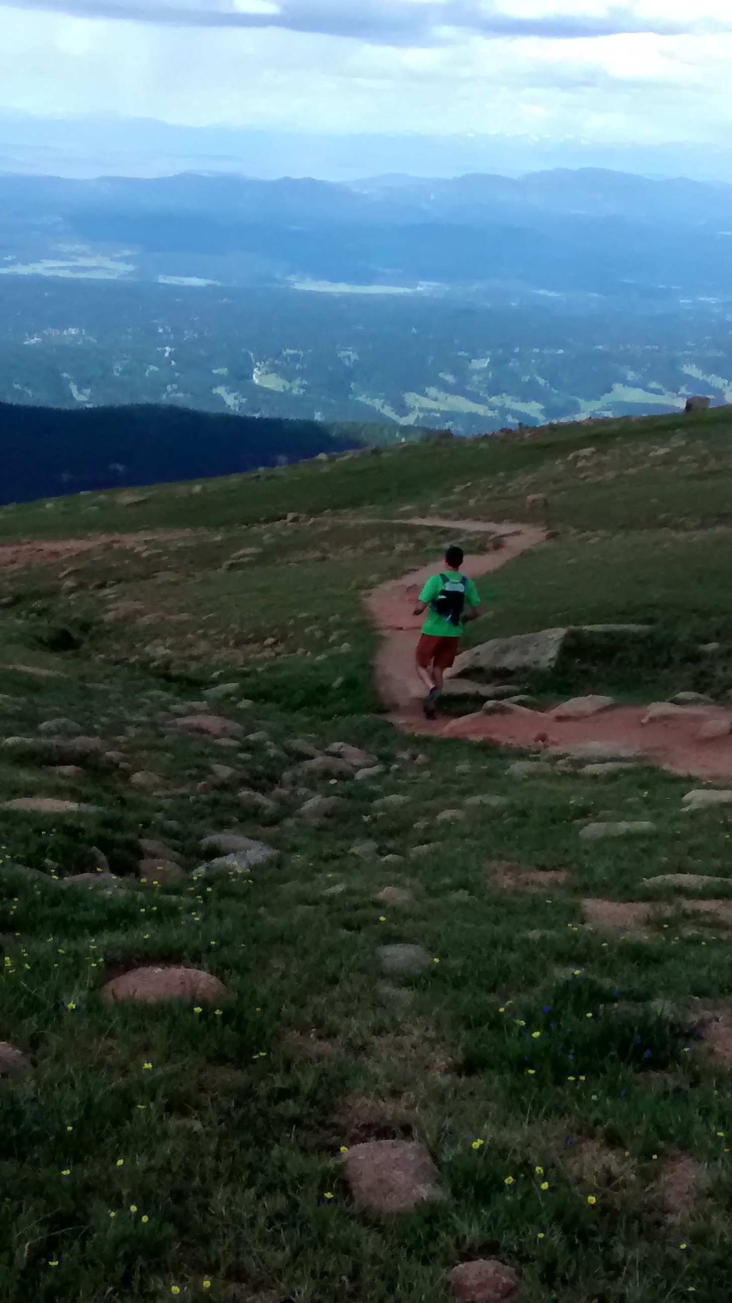 This was going to be stout — 4300′ in 7 miles up, then back down. This just 2 days after the 20 miles Ben and I put in at an average of 11,000 ‘ over in Breck. But there were donuts waiting at the top! Pikes is one of those mountain summits that has a road to the top (as well as a train!), along with a gift shop, deli, etc. But we heard the donuts were good and were determined to earn them the hard way! 🙂
