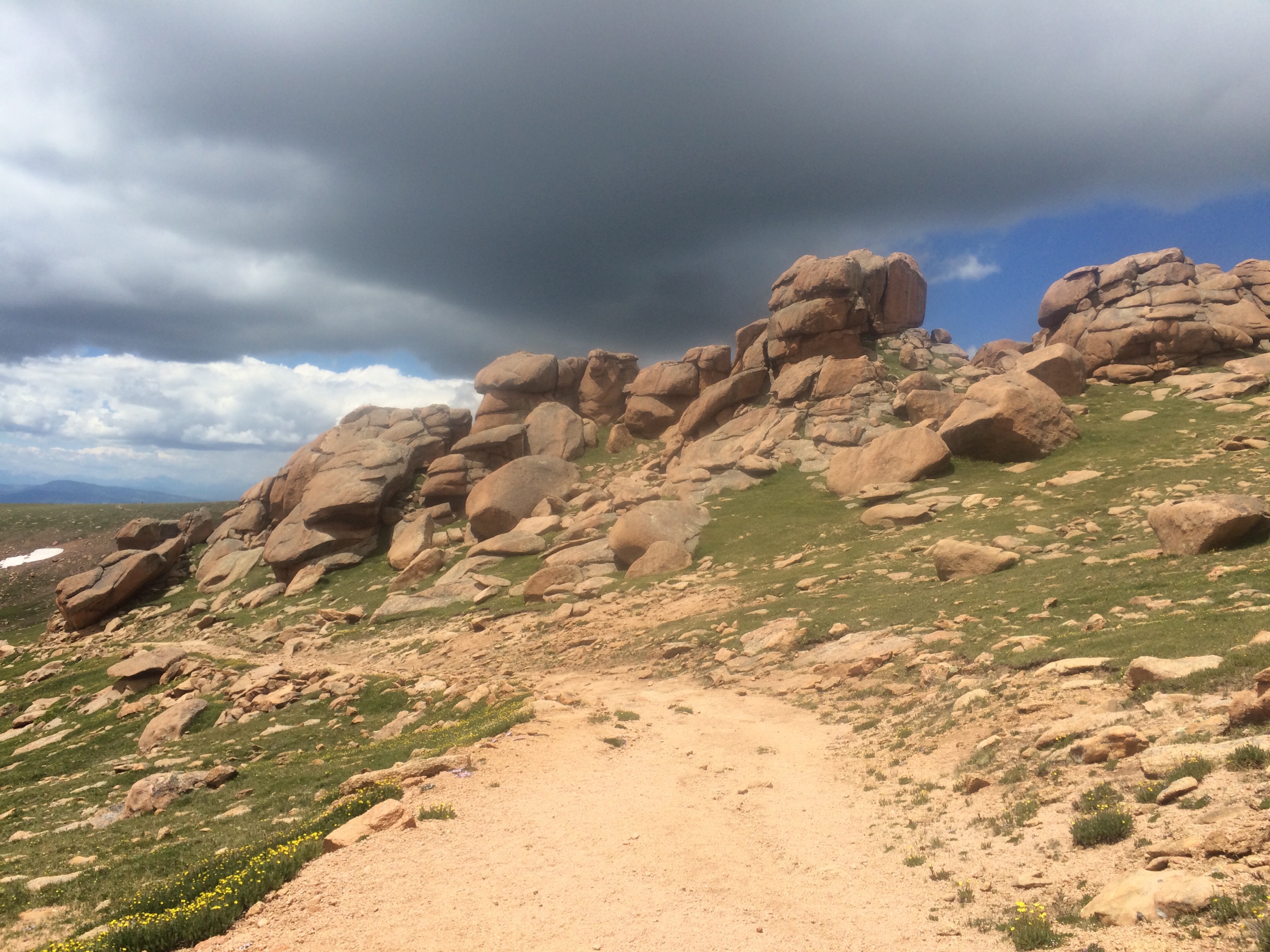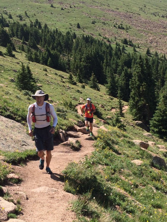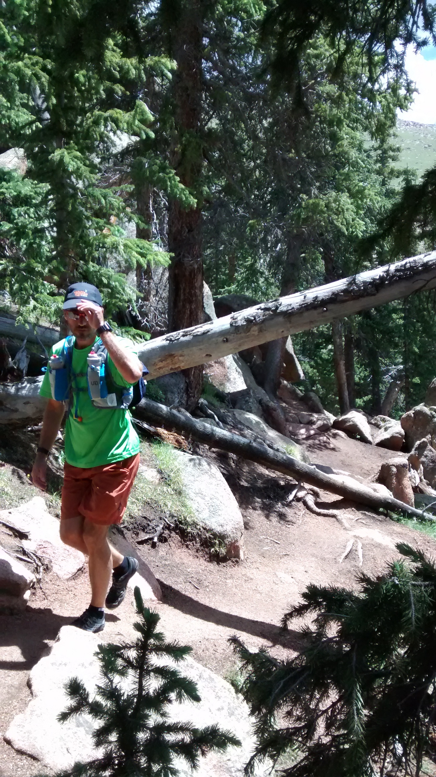 When in Colorado in July or August, I always try to squeeze in a 14er… I hadn’t done Pike’s yet, and hadn’t seen Gordo for two years since he paced me through Leadville… We got a bit of a late start, as Ben was on call until 6 a.m. and had a call come in that kept him up until 2, but eventually we were on the road a little after 7, picked up Gordo a little after 8, and made it to the trail head around 9 a.m.