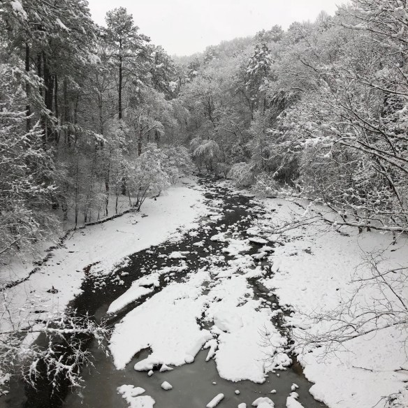 I was able to get out in the snow today and run from home to the Haw River and back. I wanted to share some photos here.