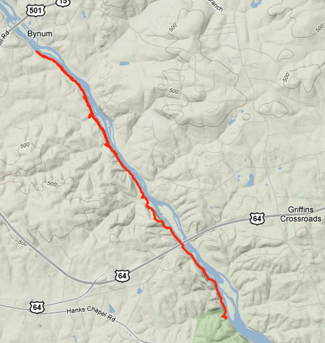 I made it to about a quarter mile south of the old Bynum bridge, and I could see the dam at 15/501. But I turned there because I reached someone’s personal property. There were yellow signs showing the “state park” land but with the water as high as it was, I didn’t feel like trespassing. Never know who might pull a shot gun on you! (Next time I’ll just jump on Bynum Beech Road, which I ran next to for a bit.)