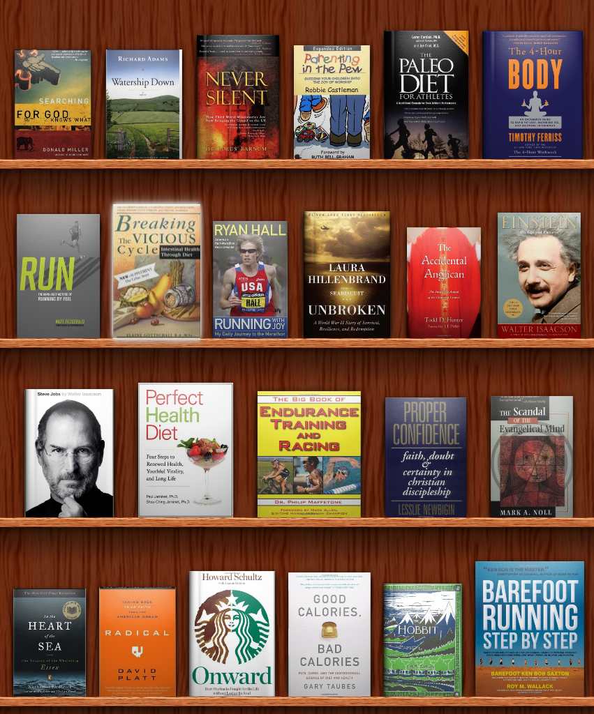 If I were to make recommendations, “Unbroken,” Watership Down,” and “The Hobbit” are must reads in the fiction category. “Steve Jobs” is an amazing biography of a pretty amazing man that influenced our technologies tremendously during his life. “The Perfect Health Diet” is probably the closest to where I am in my diet right now, though I’d guesstimate I’m only 75-80% PHD compliant. And finally, “Never Silent” is truly an amazing and eye-opening account of where and how the Anglican Church in America has come to be…