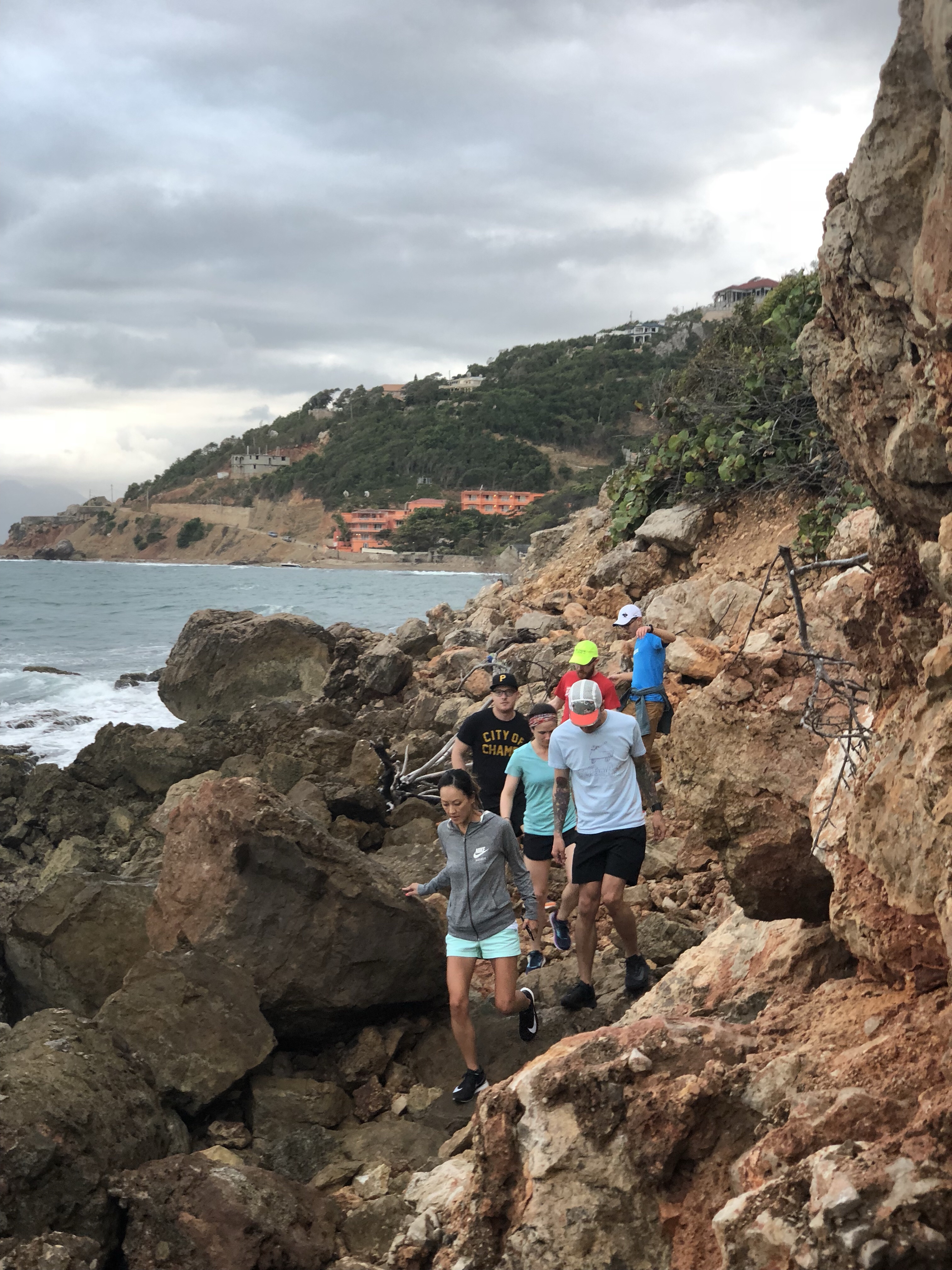 At the very beginning of the 2nd climb, both upper quads locked, and I had to sit. Within a minute of sitting, I projectile vomited – something I’ve never done! This lasted 2-3 minutes, and I lost all hydration and nutrition for the last hour or so. And I should rewind just a minute — when we started up Chimney there was an aid station, and I tried to eat one bite of a bar, but it didn’t go down well. And either just before or after that, I think before, I had tried to slurp a bit of gel, and that almost came back up.