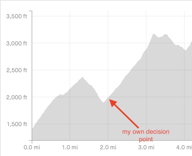 I knew a 2nd chimney climb was going to be tough and take a long time, and I only felt worse and worse. Chimney has an initial climb before you drop down some to tackle the big climb (see profile below). I sat at the top of that initial climb for a few minutes thinking I should probably go back, but opted to keep going forward.