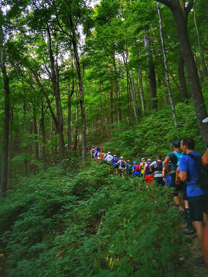 Last year I was fit, and went pretty hard at the start to use the ~1+ mile road lead in to the single track to get towards the front (which in reality was probably the top 40 or so). There was still a conga line, but not terrible — everyone in the group I was in had pretty solid power hikes so it was never a problem.