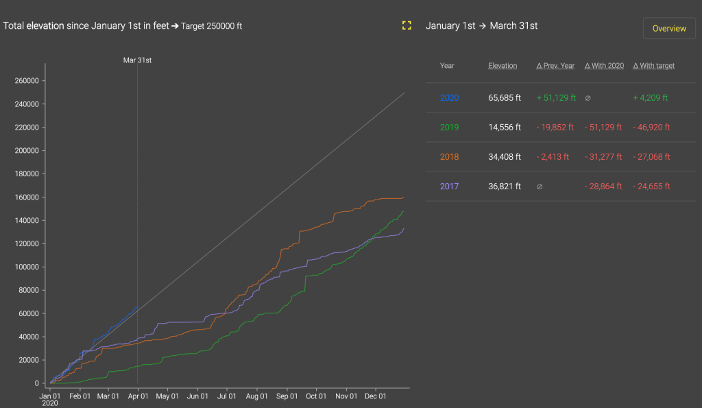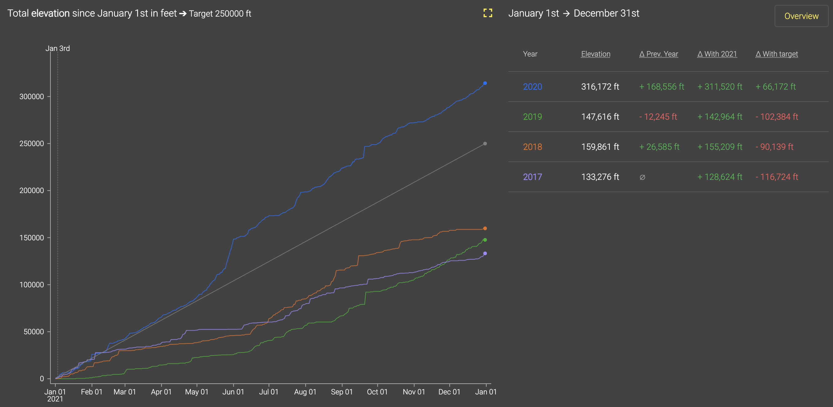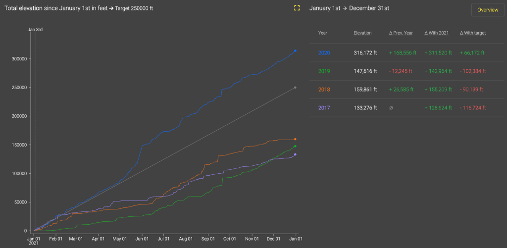 First up, total elevation, which was really my main goal this year, and you can see I’m pretty far ahead of my goal. The Limitless Vertical Challenge, and more time in the mountains due to less travel (in turn due to COVID), means a lot more climbing: