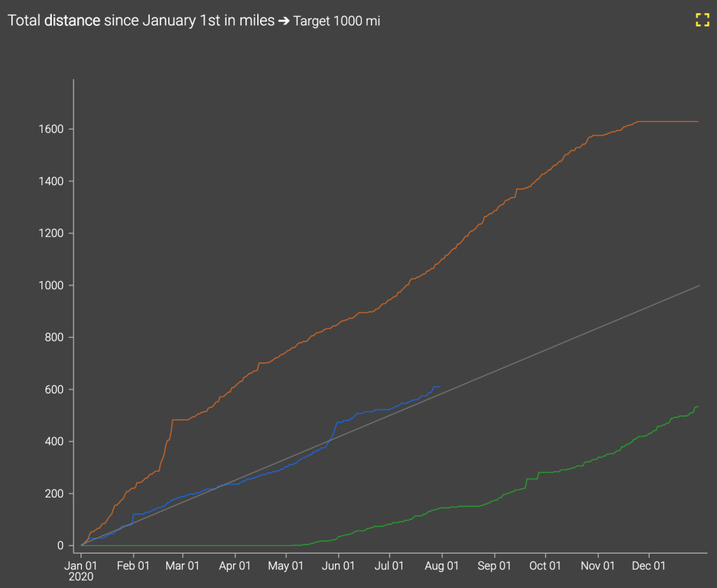 Finally, total distance for all activities, also far behind. This is mostly behind due to lack of cycling mileage described above.