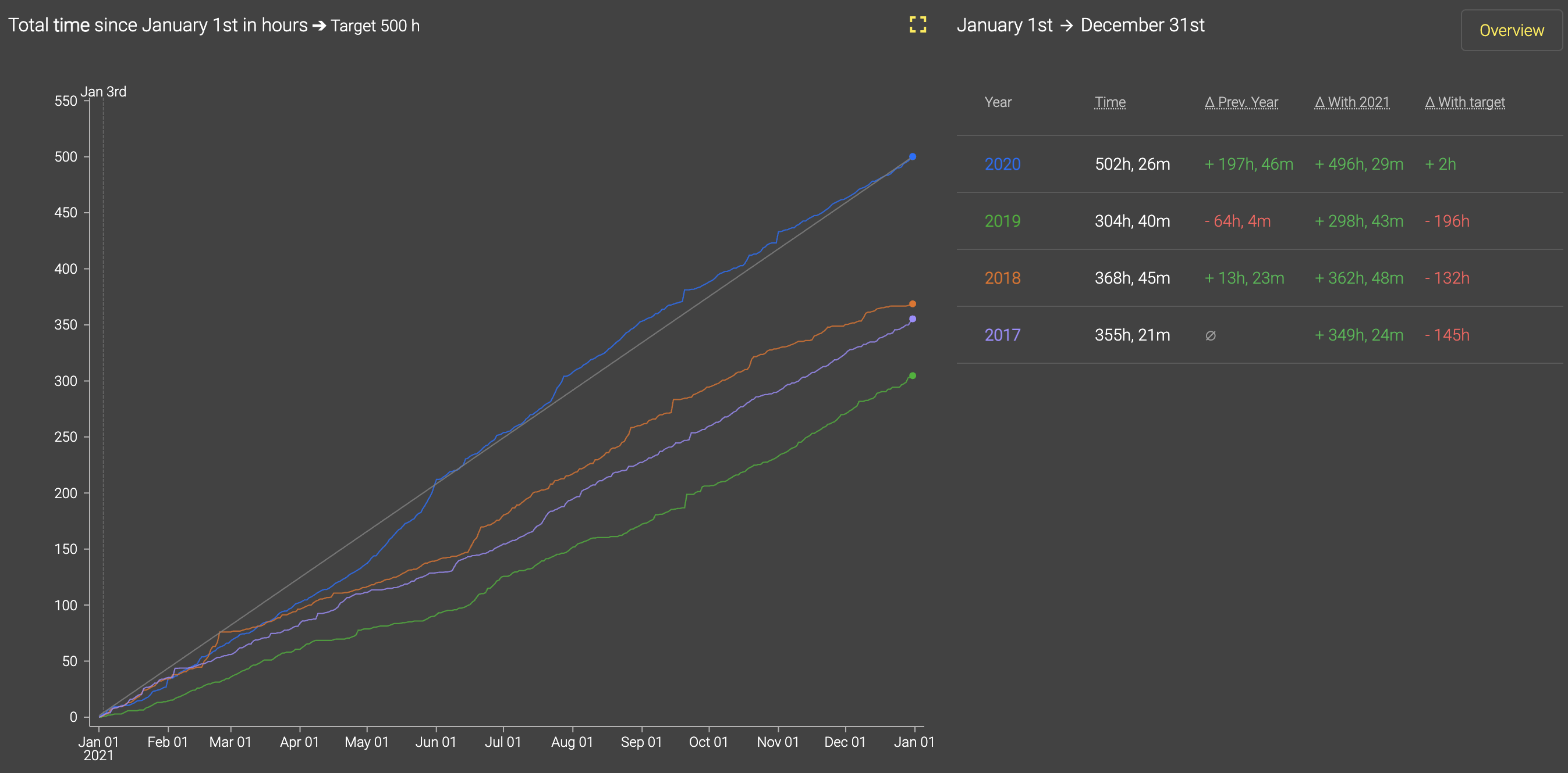 Next up is my time goal, which I set somewhat arbitrarily at 500. After looking through “The Uphill Athlete” last year, I realized my yearly hours trained were pretty tiny compared to some athletes! Now, this number does include a lot of hiking and walking — but only walks when it was somewhat of a workout, not just walks that were super casual. And again, I hit this target with just (barely) over 500 hours. I went ahead and bumped this to 550 for 2021, mostly because I want to (need to!) get serious about strength training now that I am 50, and I have made it a goal to lift 50 hours in 2021. Now, I may include mobility and balance in one umbrella – I’ve not quite decided. But I do some of that kind of stuff outside of a training session — just when I walk by a balance disc or am sitting in front of the TV.