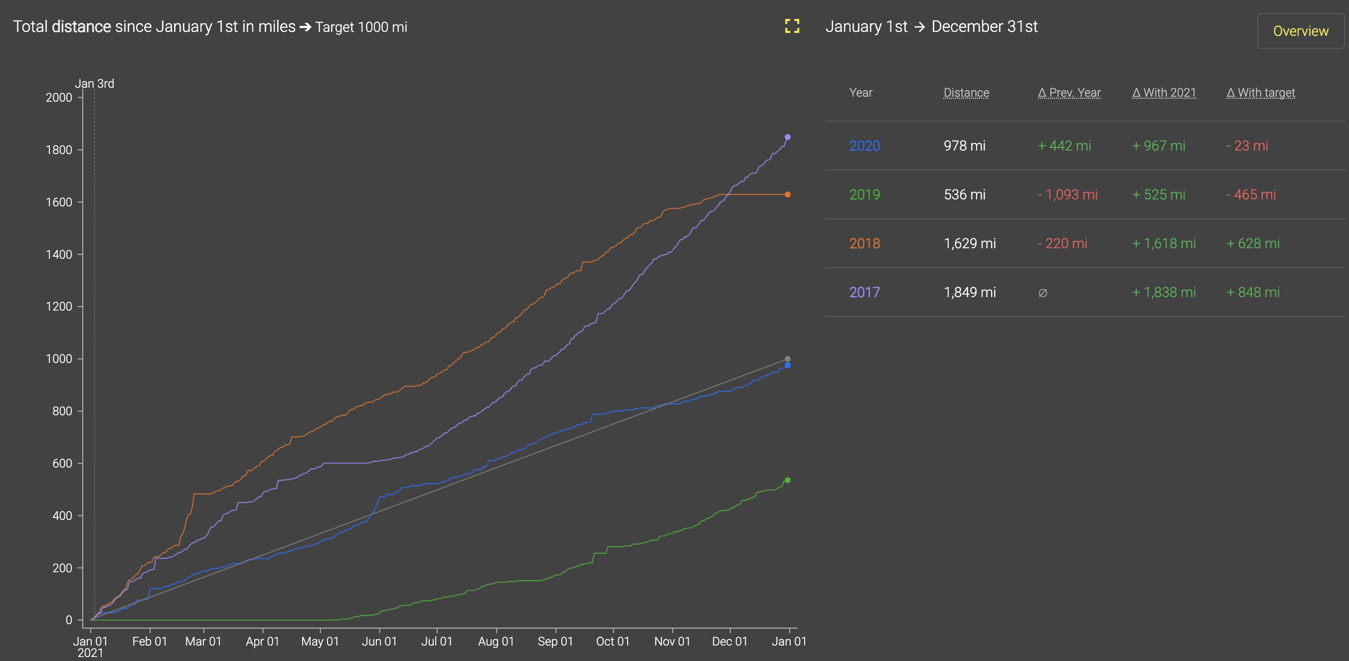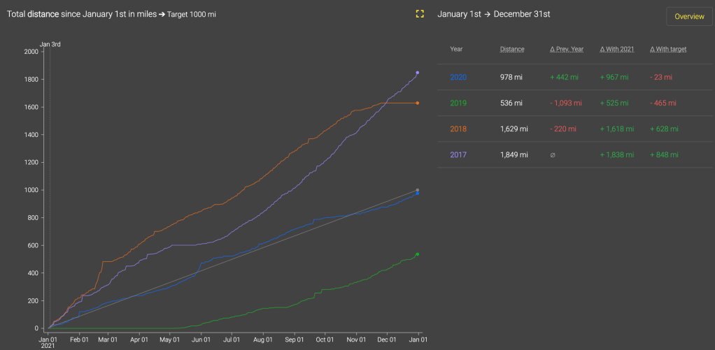 Next up is running, for which I fell just short of my 1000 mile goal with 978 miles. I’m not disappointed in that at all, as I feel like a more well rounded athlete doing all the other sports again, especially mountain biking! I’ll keep this at 1000 for 2021, though a lot of that will depend on which races happen next year!