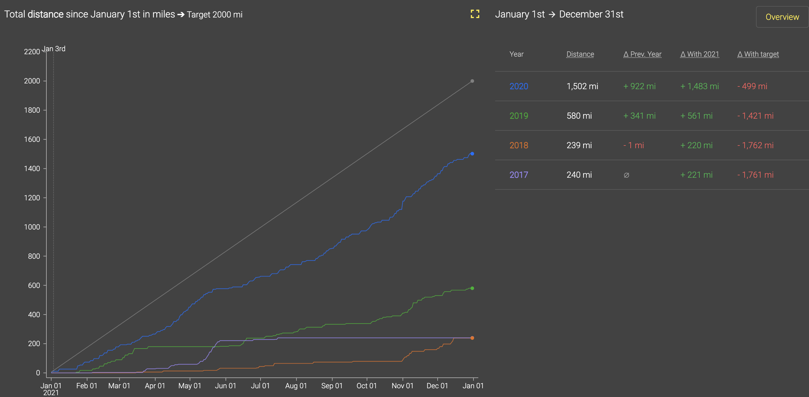 And finally biking…. I set an aggressive goal of 2000 miles, but I rode the mountain bike more than expected (as apposed to Zwift or road riding), which is always going to be fewer miles per hour. But I had a blast doing it and wouldn’t change that. I’ll probably change the 2021 goal to 1500 or 1750, but I am Zwift’ing more now than last year, so maybe 2000 is within shot and I should just keep it the same?
